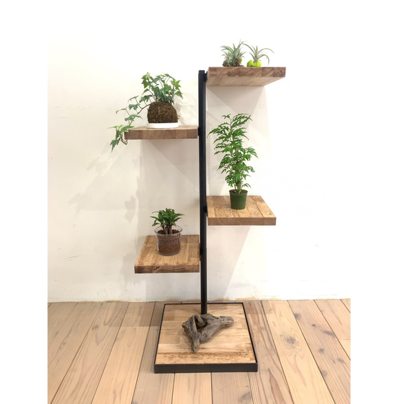 くるくる回転する4段バージョンの回転シェルフラックになります。 植物を飾ったり、一味違ったインテリアとして重宝される1品なので、家の玄関先や店舗などのワンポイントとしてご利用いただけます。 360°回転する使用になっており、板幅をバラつかせる事で様々な用途で色んな表情をみせてくれます。壁に付けても交互にできたり、雑誌も置けたりと使い勝手とルックスを考慮して製作しました。 背の高いモノでも棚を回転させることによってディスプレイできるのが最大の特徴となっております。 1段に対して6kg程度の重さにも耐えれる作りにしているので、観葉植物をディスプレイするのには最適となりお手入れもしやすいです。 SIZE:幅30cm 奥行き30cm 高さ85cm アイアン部:黒皮風焼付塗装 木材部:ミディアムオーク風仕上げ 回転棚:幅24cm 奥20cm (底以外の棚は4段とも360度回転いたします) |